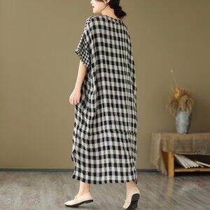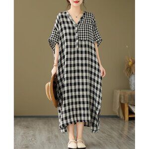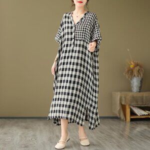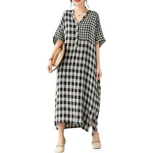 Women's Linen Dress Summer Casual Loose Gingham Midi Cotton Flowy