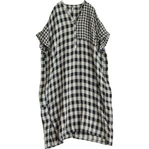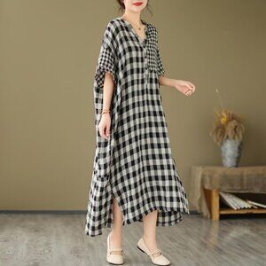 Features: This breezy dress features a V-neck, short sleeves, and a button-up front. The contrast checker pattern adds a playful touch. The irregular slit hem and empire high waist make it a fun, flattering choice, great for hiding the tummy while staying stylish. Made of soft, breathable cotton linen fabric—no see-through! Perfect for warm weather or layered with a jacket.