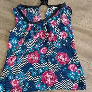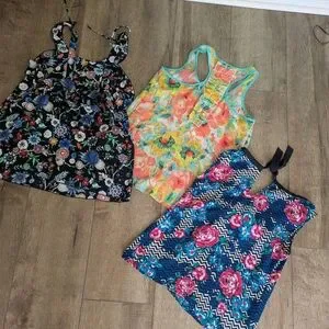 Set of three vibrant tank tops with floral and chevron patterns. Perfect for casual wear.
