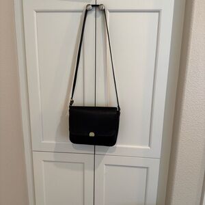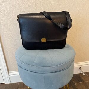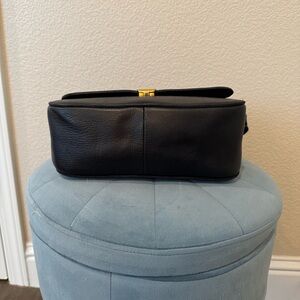 This elegant black leather shoulder bag is perfect for any occasion. Its sleek design and high-quality material make it a must-have accessory. Some natural patina, gently used, missing the prong for metal clasp but still fully functional when closed as it has a magnetic closure.