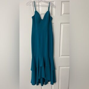 Make a statement in this stunning strapless teal gown. Perfect for formal events, its intricate beadwork adds elegance and charm.