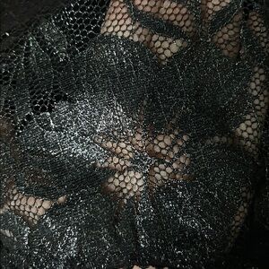 Open crisscross back thong bodysuit with a glittery finish and a floral pattern. Tags still attached. Stored in basement.