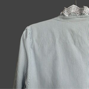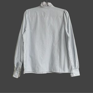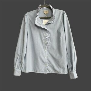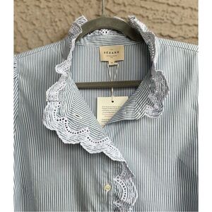 SEZANE Blue White Pinstripe Ruffle Lace High Neck Striped Button Down Chlo Shirt