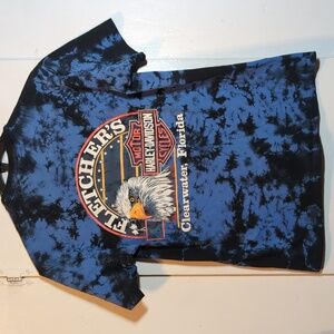 A Vintage 90s Tie Dye Harley Davidson Clearwater, FL tee in men's size XL. This tee was made in the 90s by Harley Davidson for a dealership in Clearwater, Florida. It features a sick neon blue and black tiedye pattern. The front has a print of a horse running in front of an American flag reading THE IRON STALLION with a red HD bike below. The back features a large print of a bald eagle head with HD logo and the dealership it's from. This tee is in excellent condition with no stains, frays or signs of wear. A unique Harley tee.