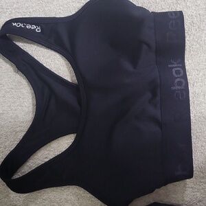 2 womens sports bras both size xs. One is Reebok, has some wear on front logo. Black and razorback with removable cups, cups included. Other is Nike black razorback, no removable cups all lined in. Has gold stitch on bottom, see photo. Slight mesh detail on back part. Both GUC.