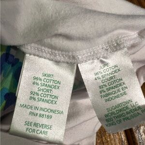 Faux button front. Shorts under skirt are 92% cotton, 8% spandex.