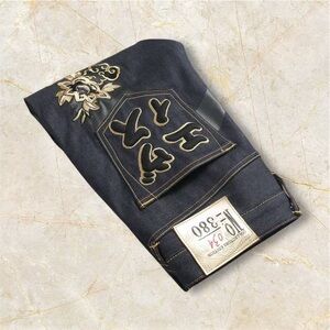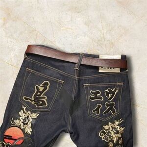 Elegant dark blue jeans with vibrant embroidery. Features unique floral and bird designs. Ideal for a standout look.