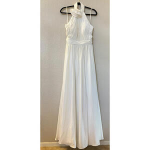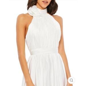 New Mac Duggal Rosette Halter Neck Chiffon Evening Gown In White Satin Sz 8 $398