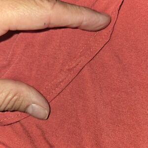 The Garnet Hill rusty orange tank dress with a faux wrap in size XL is a stylish and comfortable option for women looking for a casual or travel outfit. This sleeveless dress features a V-neckline and a pullover closure for easy wear. Made from viscose jersey fabric, it is super soft and comfy. The rusty orange color and midi length make it perfect for warm days in the summer, fall, or spring. The tank style and faux skirt wrap add a touch of femininity to the overall look, making it a versatile and trendy piece for any wardrobe. There are two tiny flaws in the seam of the hem where the sewing has caused tiny 'bubbles,' shown in photos.