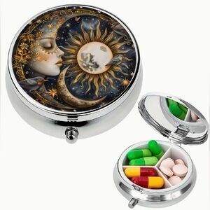 Celestial Inspired Round Pill Organizer 3-Compartment Compact Pill Case New