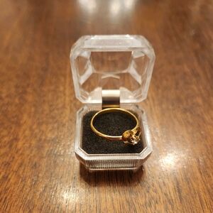 This comes with a cute ring container! The ring is adjustable and is a thinner material. You can easily bend the band open more or closed more to fit any finger. It is heart shaped with a center jewel.