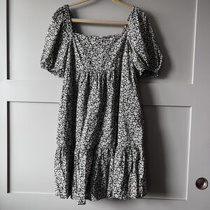 Design features: Ruched drape at the hip with a faux wrap tulip front hem