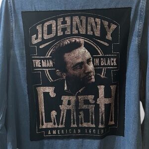 One of a kind handcrafted upcycled denim top featuring a Johnny Cash graphic on the back. Perfect for casual wear.