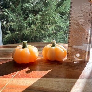 Orange calcite pumpkins with jade stalk. Approximately 2” wide. 1.5” tall.