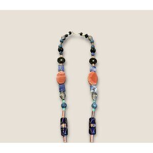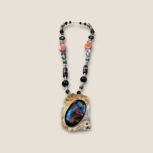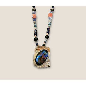 This statement necklace showcases a striking dichroic glass pendant paired with an eclectic mix of beads in various colors. The blend of textures and hues makes it an eye-catching accessory for any ensemble. The necklace's unique design infuses a touch of artistic flair into your jewelry collection.