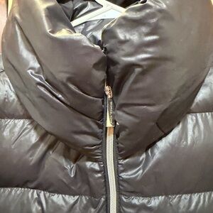 Elegant black puffer with quilted design. Features a high collar and zip closure. Ideal for chilly days. Very chic. Like new condition.