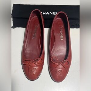 Stylish CHANEL flats with a cream body and black cap toe. Features a chic bow detail. Ideal for versatile wear.