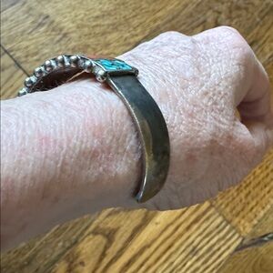 Stylish bracelet with inlayed turquoise and red coral mosaic design. Perfect for adding a pop of color. Unmarked. Purchased at an estate sale where they were selling mostly Navajo pieces