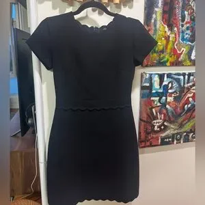 Chic black mini dress with scalloped neckline and sleeves. Perfect for stylish outings.