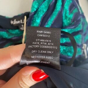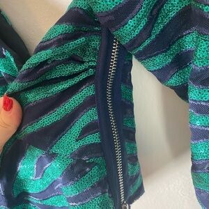 She's a fox. The Vixen Asymmetrical Top features a tiger sequin embroidery on tulle, an asymmetrical off the shoulder silhouette, 3/4 sleeves and a side seam metal zipper. Pictured with the Billie Vinyl Mini Skirt.