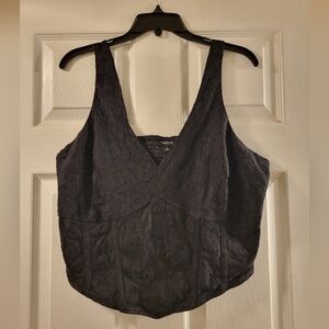 v neck line with ruffle detail, pinched middle detail between chest and a fitted band detail around waiste and flares out