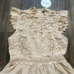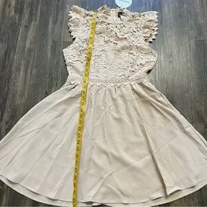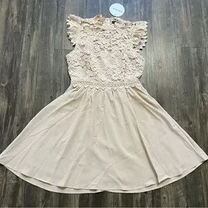 Gorgeous NWT tan short sleeves Flowy dress. Lace front crew neckline. Back zipper.