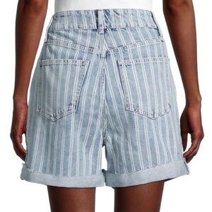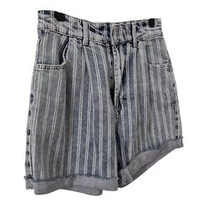 Vintage-inspired denim shorts in a striped finish feature a high-rise silhouette with pleat detail and rolled bottom cuff.