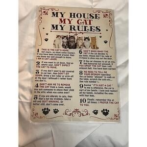 Metal cat wall sign that reads “My House My Cat My Rules.” Vintage-style print with paw accents and four corner holes for easy hanging. Lightweight tin/metal—great cat lover gift, kitchen, entryway, office, or she-shed décor. Modern reproduction. See photos for exact design and condition.