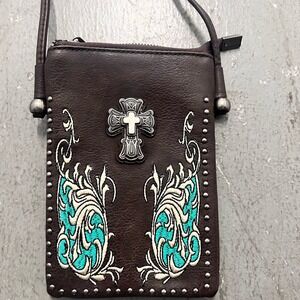 American Bling Western Leather Embossed Turquoise Cross Studded Crossbody Bag