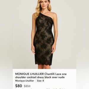 Elegant Monique Lhuillier one-shoulder cocktail dress featuring intricate Chantilly lace overlay in black over a nude lining. The perfect statement piece for formal events, weddings, or cocktail parties.