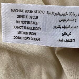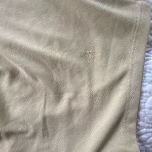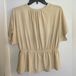 This beige colored top features a crew neckline, short flutter sleeves, and a peplum style. Perfect for a casual or dressy look. There is a small flaw (pull) on front of right sleeve. See the last photo.