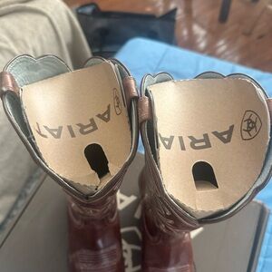 Elegant Ariat cowboy boots in chestnut leather. Features detailed embroidery. Women’s size 8.5 wide. I don’t think they were ever worn.