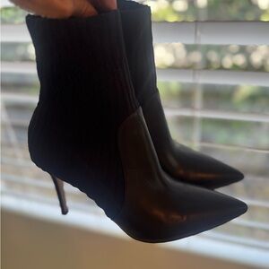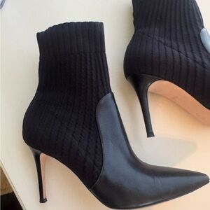 Step out in style with these elegant black ankle boots. Slip on style. Bottom is leather and ankle is black knit for easy slip on. Absolutely beautiful. Hardly worn and great condition.