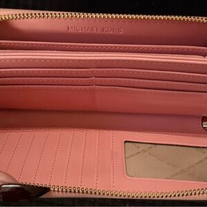 Elegant Michael Kors wallet in salmon and white...Features iconic MK pattern...Ideal for stylish storage...Plenty of card slots...only used once