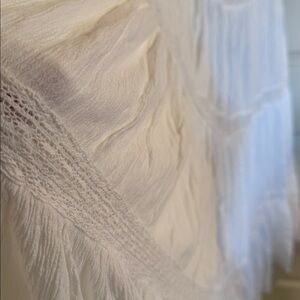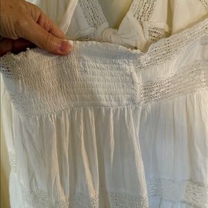 Features: Gauzey fabrication, V-neckline, tie-front closure, flyaway design, smocked backing, lace inlays, self-tie halter closure
