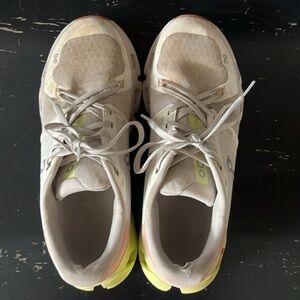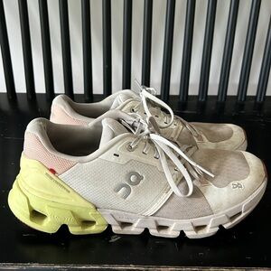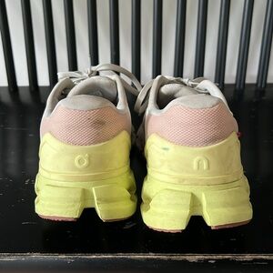 Stylish On Running shoes for women. Features a white upper with pink and green accents. Perfect for athletic activities.
