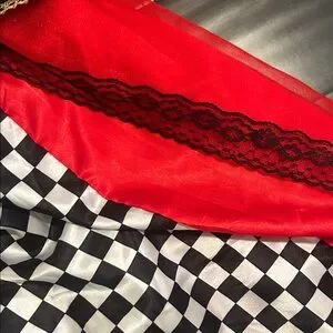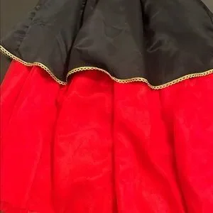 Enchanting Queen of Hearts costume for kids featuring vibrant red and black colors. Perfect for dress-up and themed parties.
