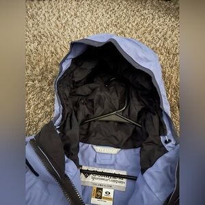 Columbia jacket in light blue with black trim. Features a hood and zippered front. Embroidered logo on chest. Excellent condition like new