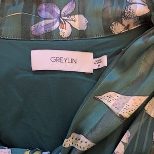 EUC Greylin Anthropologie womens medium Estelle tie neck blouse green floral