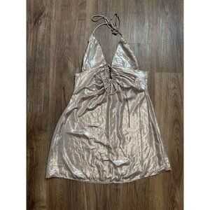 - Features: Halter neck, tie detail at back, mini length, metallic finish