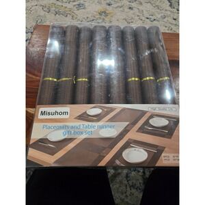 NEW - outer box skightly damages on top. Item is undamaged in box. Complete dining set for a stylish and practical table setting. Includes placemats and a table runner designed with a woven crossweave pattern. Features a washable surface, making it easy to clean and maintain for everyday use or special occasions. Comes in a gift box set.