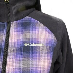 Columbia full-zip hooded fleece jacket in excellent condition. Features a soft navy fleece body with purple and blue plaid panels on the front, back, and inside the hood. Designed with a full front zip, high collar, and flattering contoured fit for warmth and comfort. Perfect for layering on hikes, outdoor adventures, or everyday wear.