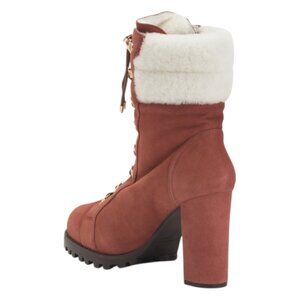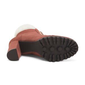 gold tone hardware, block heel, lug sole, shearling collar and lining