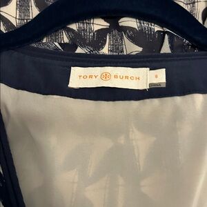 Tory Burch Sleeveless Silk Dress - w faux wrap skirt. Size 8. Has invisible side zip. Dress is fully lined. Banded waist and decorative cording around v-neckline. Measures 38.5” from top of back collar to hem dress has not been worn.