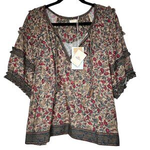 NWT Faherty B. Yellowtail Womens Multicolor Floral Ruffle Trim Bodhi Top Size L