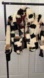 Stylish patchwork rabbit fur jacket with toggle closures. Features a mix of black, white, brown, and tan colors.