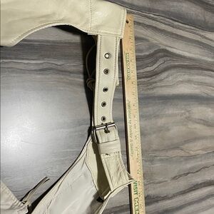 Stylish white leather vest with fringe details. Perfect for a bold look.