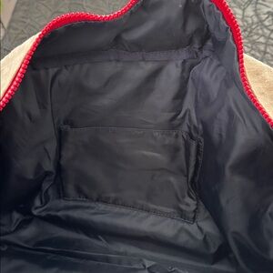 Travel duffel bag with signature logo pattern. Features red accents and adjustable strap and handles. Outside and inside pockets. Approximately 17” L, 11” H and 10” W