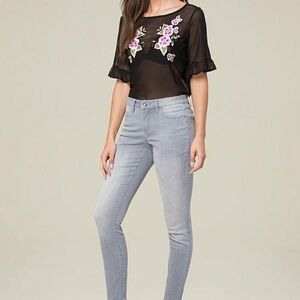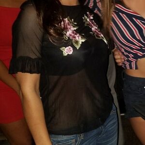 Lunch-date mesh tee stitched with sweet, colorful posies. Short sleeves with pretty ruffle finishes. Bra not included.