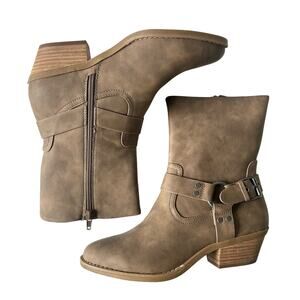 Features: All man-made materials with leather stack, stacked heel, side zip, harness detail, round toe